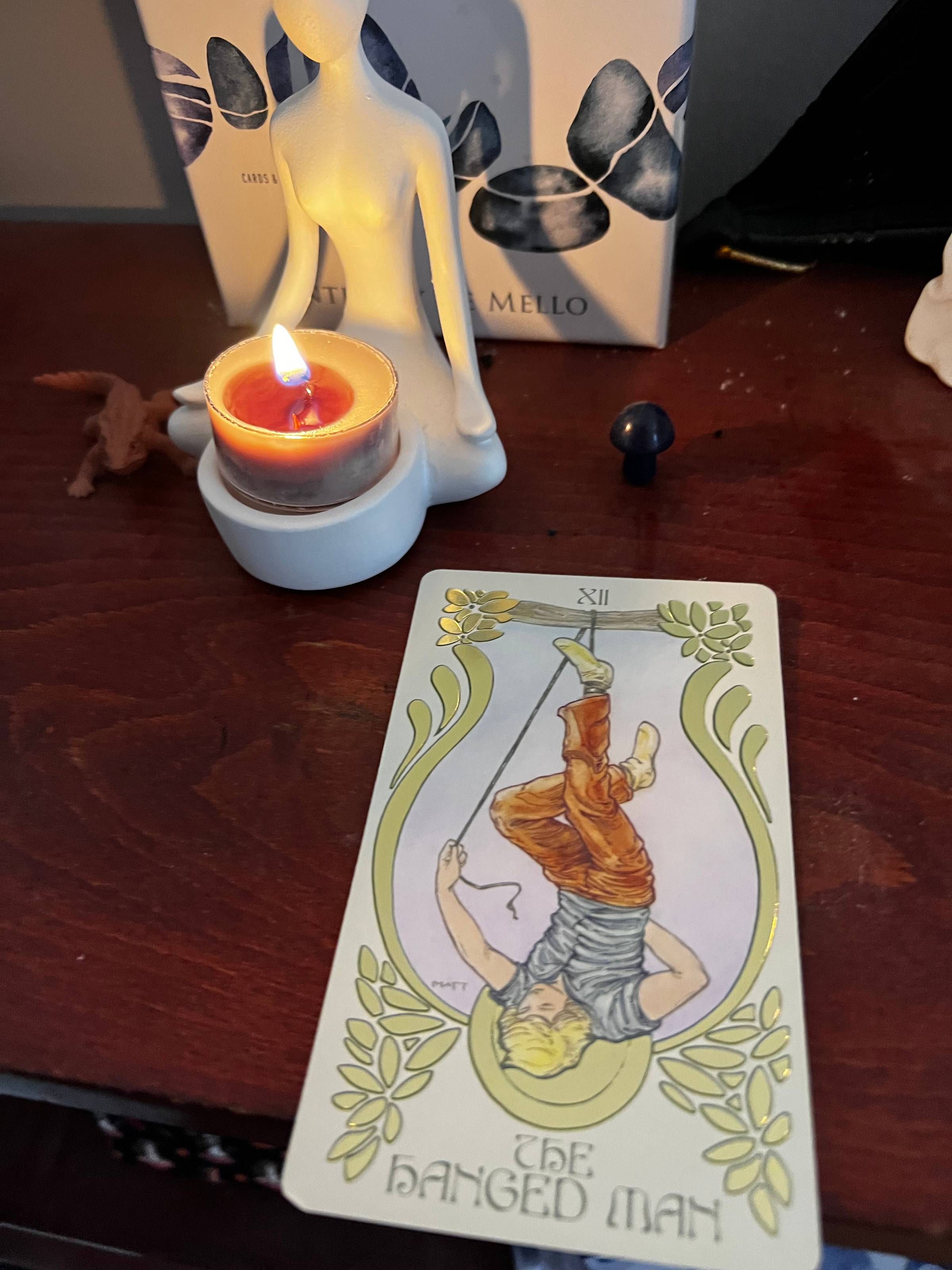 Good morning. Today's card is: The Hanged Man The practice we're called to this week is the art of staying hopeful, faithful, and sure, even though we are in a terribly uncomfortable position. Even if, especially if, we somehow got ourselves into this predicament. The hanged man is upside down, holding the string himself. This week this is a metaphor for that thing you've gotten yourself into because you initially thought it was a great idea. You planned it, you started executing, and now......